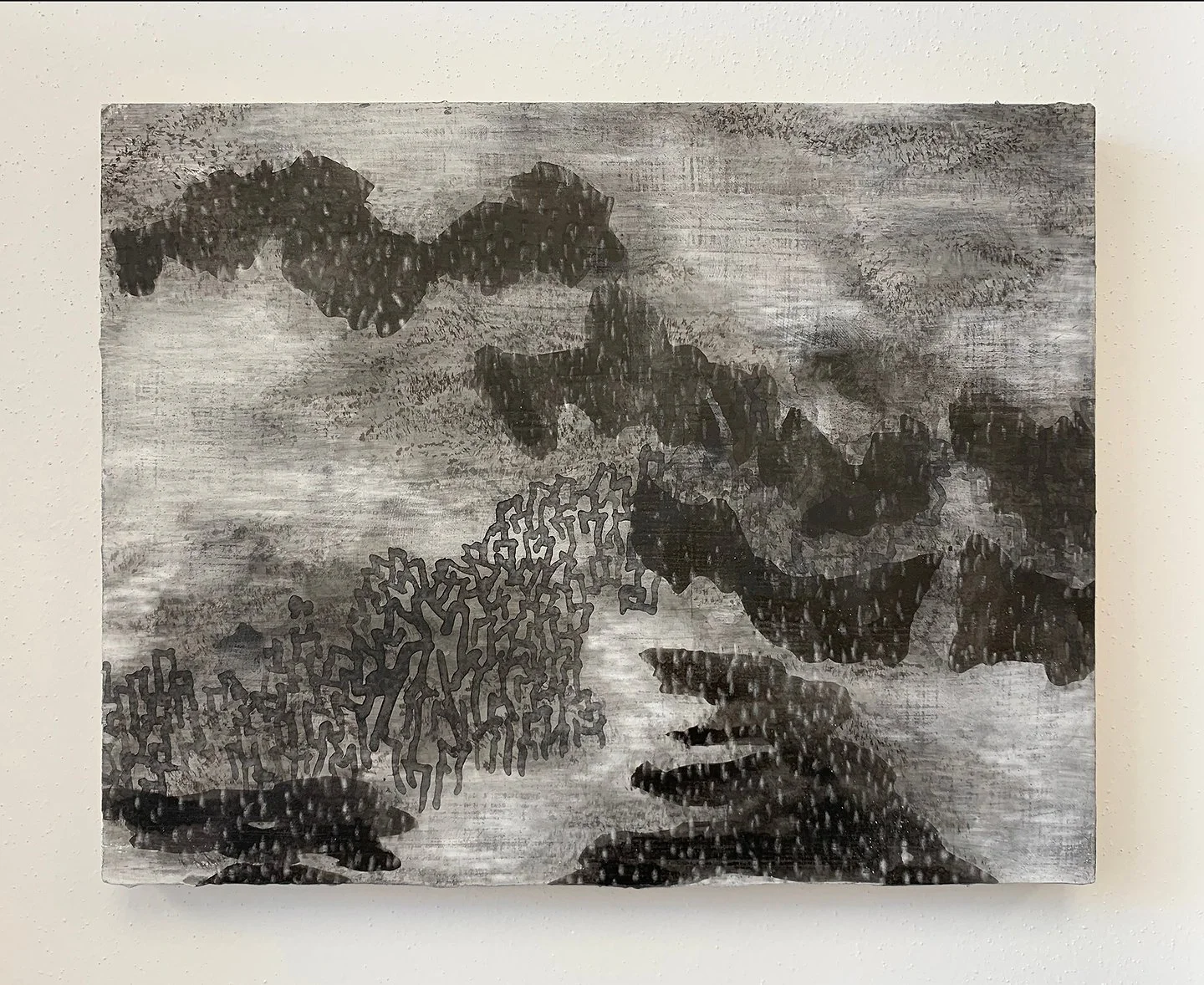 KoroKuroShioro means black-black-white in Japanese. These paintings offer spaces where viewers can privately immerse themselves in their own psychological and spiritual world. They are painted with Sumi—an ink traditionally used in East Asia made of soot and animal glue—that offers a wide range of tones and depths in black. The particles in soot—its main ingredient—carry a spirit that can be absorbed by the maker, viewer, or materials.