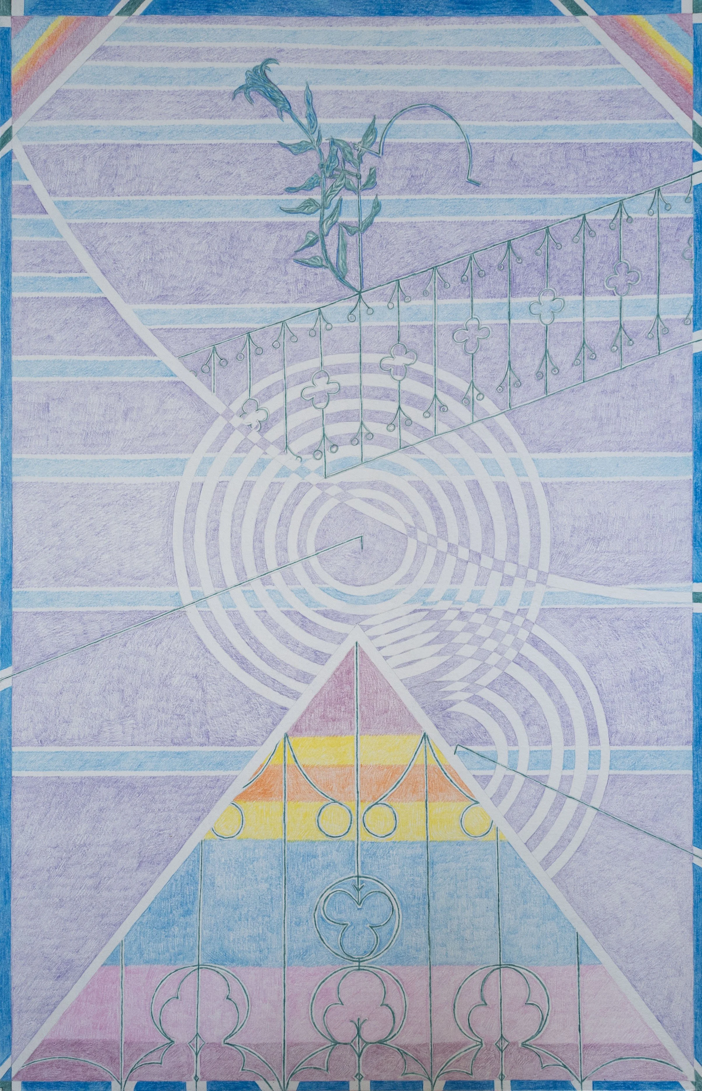 Made following a trip to Guanajuato, Mexico, this drawing layers delicate Gothic-inspired ironwork — drawn from the city’s balconies — over a central interference pattern of concentric white rings radiating across a soft blue and lavender field. Diagonal lines cut through the composition like wave trajectories; a prismatic triangle glows with spectral color; a botanical sprig curls near the surface. Here, interference becomes grounded in lived conditions — sound moving through streets, bodies gathering in public space, presence insisting on itself.