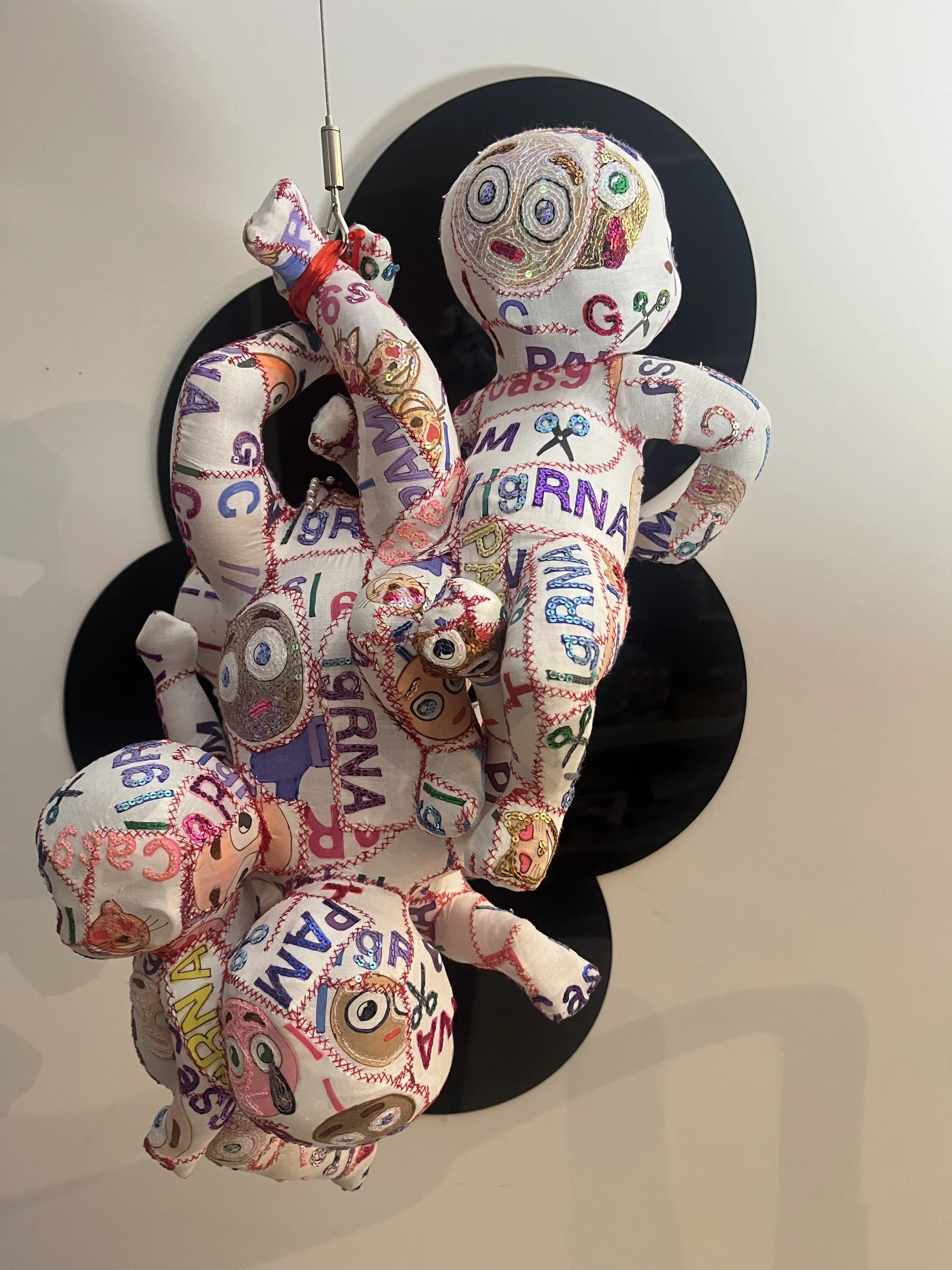 A cluster of soft, stuffed figures — childlike in form, unsettling in implication — hangs suspended against overlapping black mirror discs. Every surface is covered in embroidered and inked genetic notation: CRISPR, mRNA, scissor symbols, DNA base-pair letters. The body becomes a readable document — legible to an algorithm. Where Orthodox iconography once marked the body as sacred, here it is rendered as code. The work asks what individuality means when reproduction is systematized and the script of life is written elsewhere.