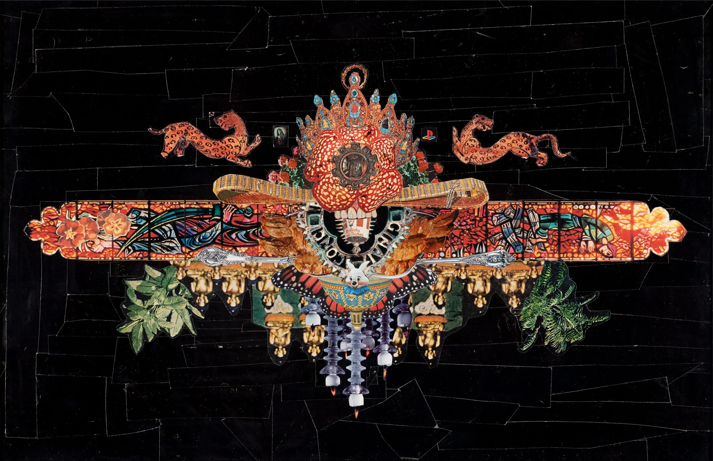 Set against a ground of layered, torn black paper, Pottasch’s collage unfolds along a strict bilateral axis — the symmetry of a mandala or altar. At its center, a dense horizontal band of fragments — crowns, leopards, religious iconography, botanical forms, and unmistakably American consumer imagery — is assembled into a form of unexpected ceremony. The traditional Indian rangoli, typically made as an offering of welcome, is here reconstructed from the detritus of print culture. The logic of accumulation becomes ceremonial, transforming disposable imagery into a structure of attention and care.