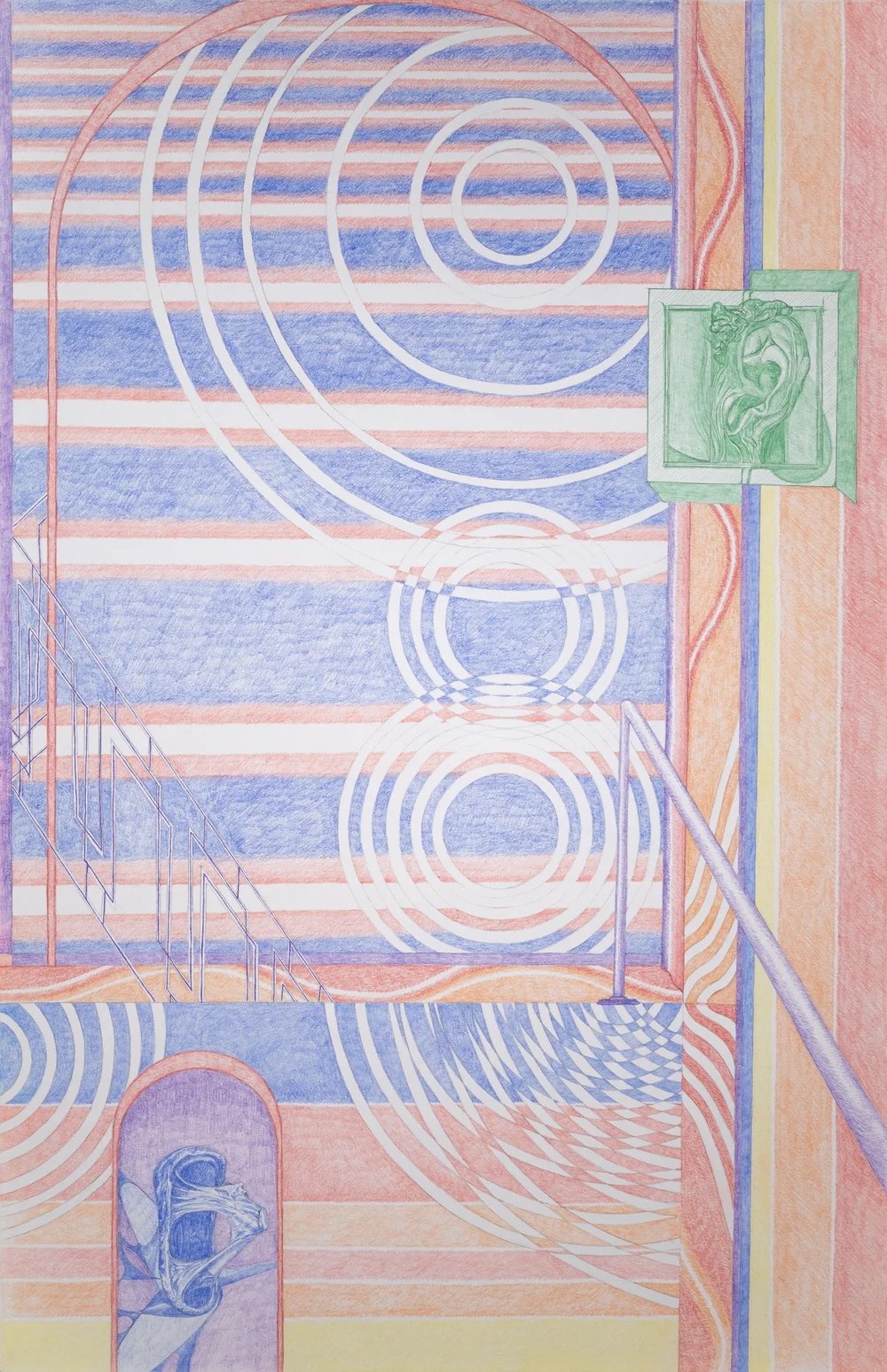 Part of the same series, this drawing extends Squier’s investigation of interference into the realm of sound. Inspired by time spent in Milan, the work connects the vibration of light to sonic experience — footsteps echoing in humid air, architectural acoustics, and the internal mechanics of hearing itself. The composition draws from specific sites, including the ear-shaped intercom of Casa Sola Busca and the staircase of Villa Necchi, while staging a dialogue between interior and exterior space, and between visual and sensory perception.