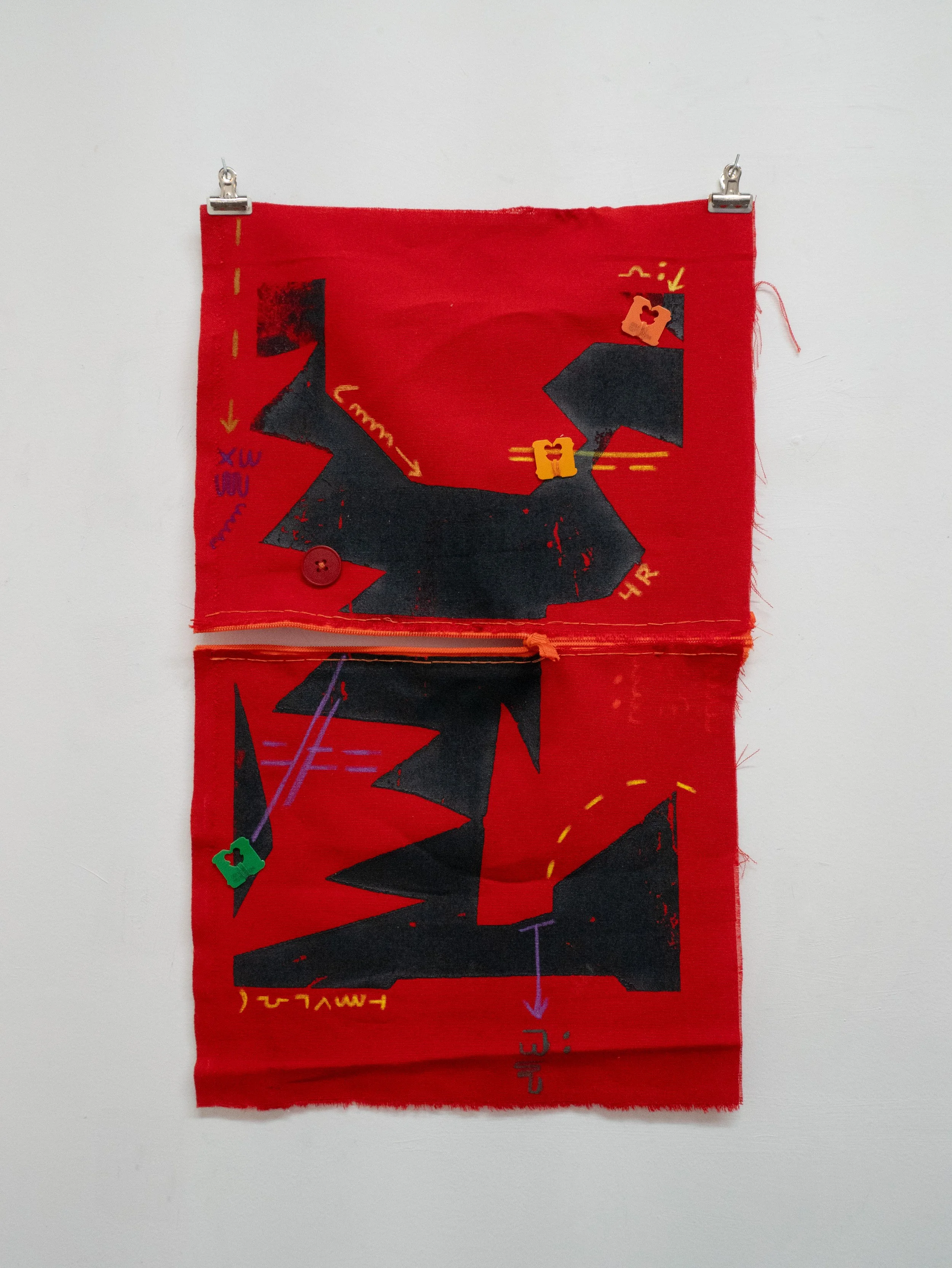 Two panels of vivid red fabric, joined at the center by a zipper, bear bold black screenprinted forms — abstracted figures or glyphs — surrounded by Moldenhauer’s evolving visual syntax and arrow-like notations in yellow and purple wax crayon. Small found objects punctuate the surface: a red button, orange and green plastic bread tags. The zipper seam running across the middle feels structurally apt: two things held together, translatable into each other, always capable of coming apart.