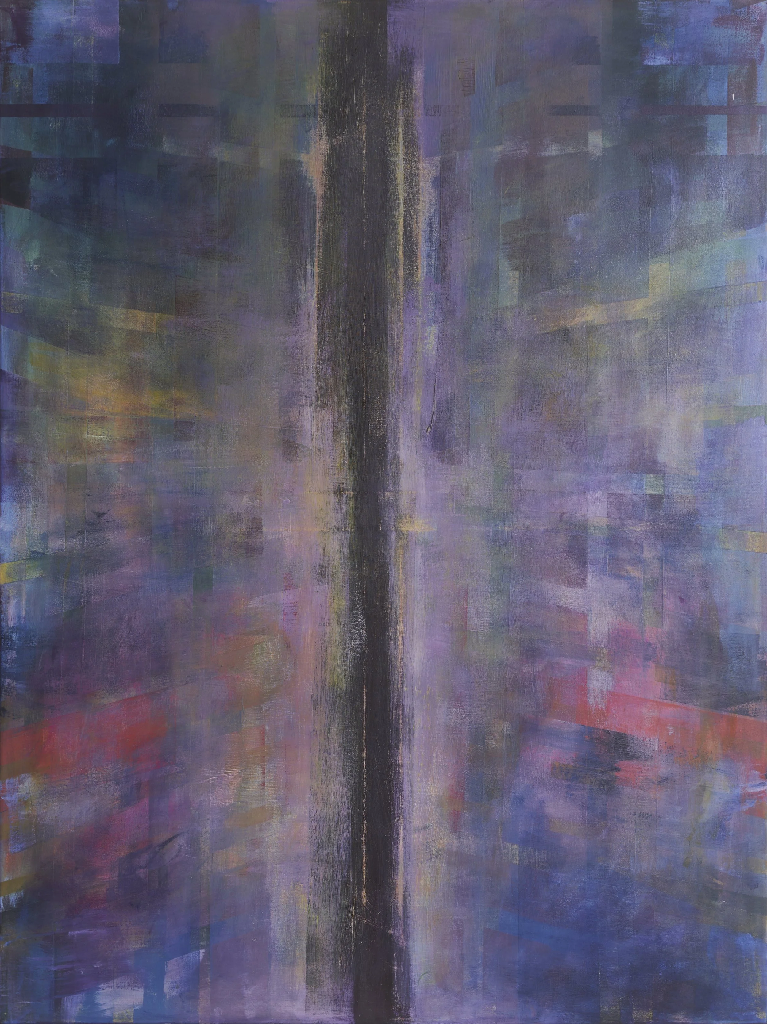 A dark vertical stroke bisects the canvas, splitting a bruised, atmospheric field of lavender, blue, teal, ochre, and red into near-mirror halves. Layers of erasure and reapplication remain visible in the surrounding surface. Here, translation emerges through paint itself — the unified image fracturing under pressure into something less resolved, more contingent. The palette carries the weight of the title: these are not colors of resolution.