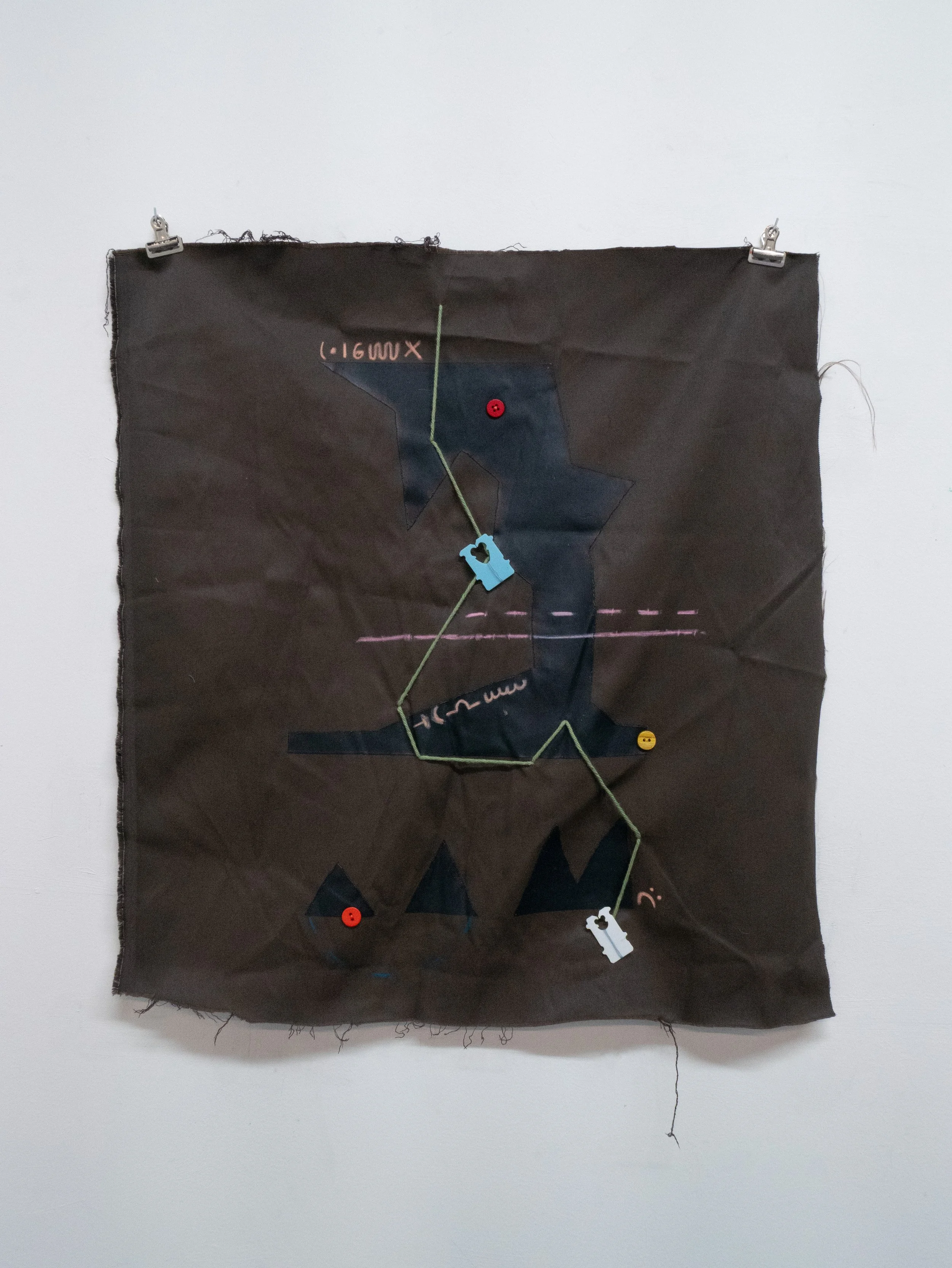 Since 2017, Moldenhauer has developed a personal alphabet rooted in her experience as a Guatemalan transracial adoptee — a tool for constructing identity in the absence of inherited language or culture. The system continues to evolve, incorporating Nahuatl, pictorial languages from the Nazca lines in Peru, and cave paintings from Serra da Capivara in Brazil. Using linoleum block printing on fabric, she builds layered surfaces with yarn, buttons, zippers, and wax crayon, forming what she describes as imaginary constellations — a language that is both invented and deeply researched.